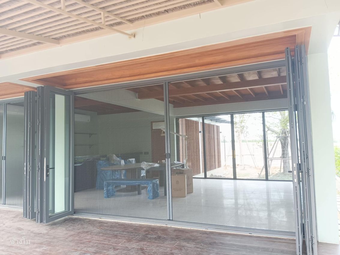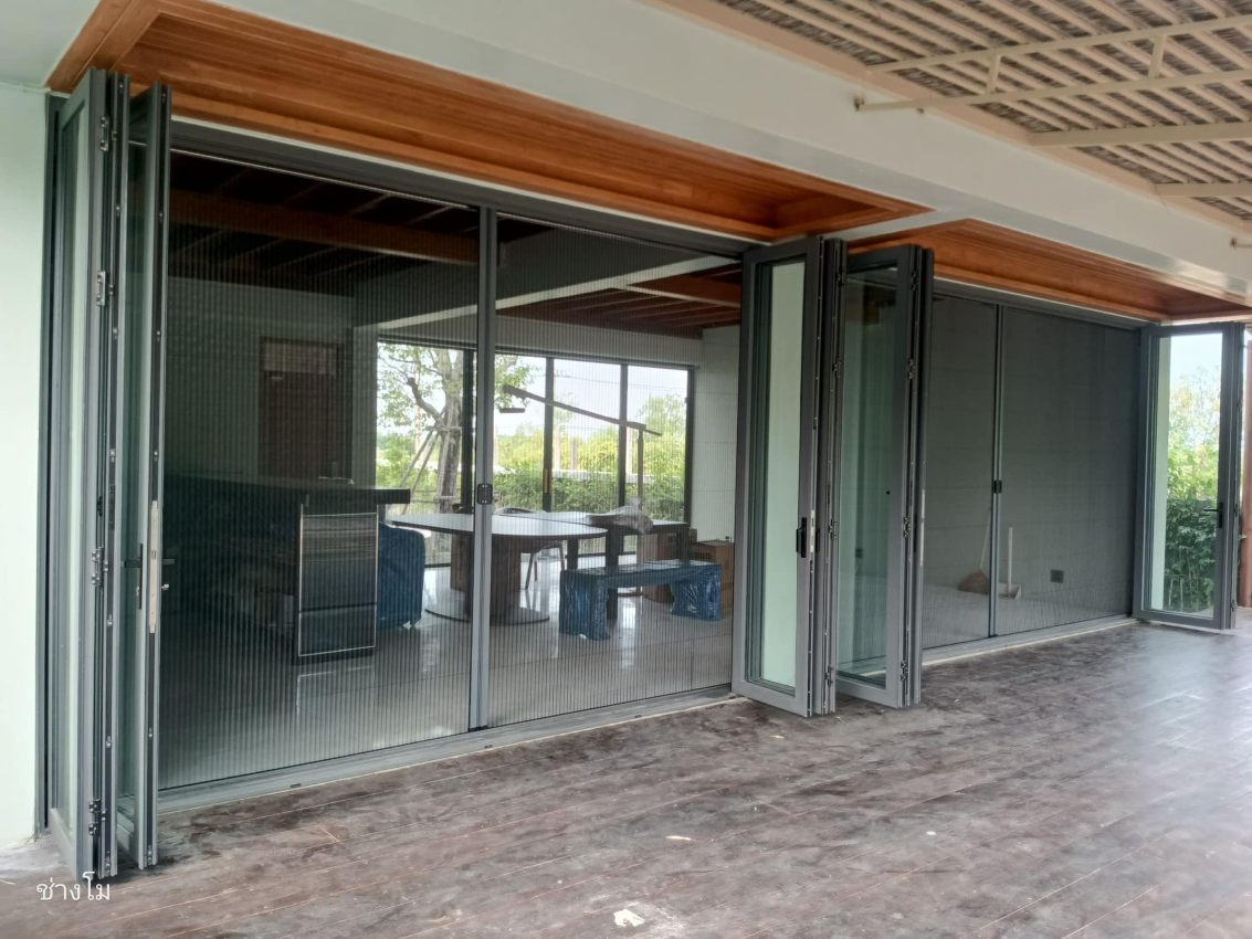 เวลาเปิดประตู มุ้งจีบจะพับเก็บไว้ในกล่องอลูมิเนียมด้านข้าง ทำให้มีความหรูหรา สวยงามมากกว่าบานเปิดปิดแบบเดิมๆ